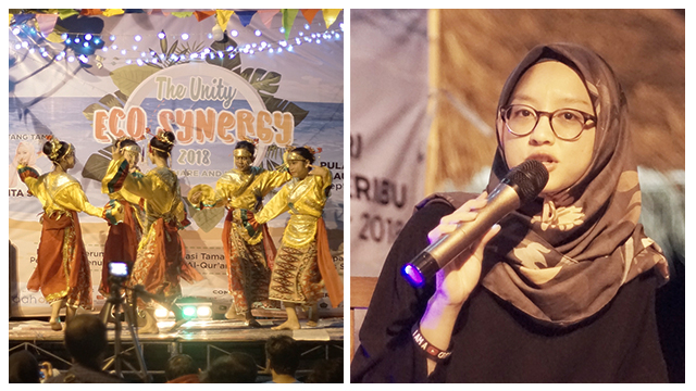 Kiri: anak-anak Pulau Pari mempersembahkan tarian khas Betawi. Kanan: Influencer, youtuber, dan penulis buku Gita Savitri berbagi pengalaman dalam Eco Synergy RISKA 2018. Foto: RISKA