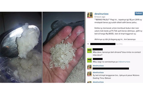 Beberapa waktu belakangan, testimoni dari akun “dewinurizza” berikut dua foto yang dicurigai sebagai beras palsu juga beredar luas di media sosial dan menarik perhatian netizen. Foto: Instagram