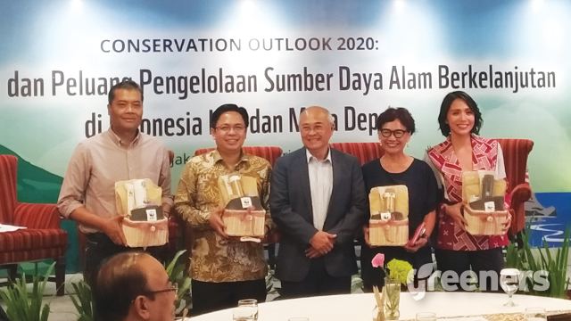 Pemimpin Redaksi Koran Tempo, Budi Setyarso, Direktur Eksekutif Indikator Politik Indonesia Burhanuddin Muhtadi, Ketua Dewan Pembina dan Juru Bicara Yayasan WWF Indonesia Kuntoro Mangkusubroto, Ketua Badan Pengurus Transparency International Indonesia (TII) Natalia Subagio, dan Moderator Andhini Effendi, dalam acara diskusi Conservation Outlook 2020: Tantangan dan Peluang Pengelolaan Sumber Daya Alam Berkelanjutan di Indonesia Kini dan Masa Depan, di Jakarta, Rabu, 29 Januari 2020. Foto: www.greeners.co/Dewi Purningsih