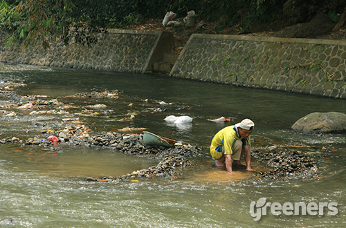 Salah satu warga sedang mengambil pasir di dekat pintu irigasi Katulampa, Bogor. Foto: greeners.co/Danny Kosasih