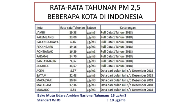 Karliansyah memaparkan bahwa berdasarkan data yang dihimpun KLHK pada tahun 2018, kualitas udara di kota Jakarta selama 365 hari terdapat 34 hari dengan status Baik, 122 hari dengan status Sedang, dan 193 hari dengan status Tidak Sehat. Sedangkan data Januari hingga Februari 2019 menunjukkan kualitas udara di kota Jakarta dalam status Baik selama 10 hari, status Sedang 38 hari, dan status Tidak Sehat sebanyak 11 hari.