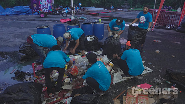 Tim less waste merampungkan pemilahan sampah dari tempat sampah terpilah di event Java Jazz. Foto: Greeners