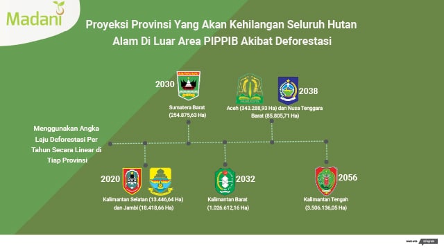 Yayasan Madani Berkelanjutan mencatat terdapat lima provinsi yang akan terancam kehilangan seluruh hutan dan alam akibat deforestasi. Provinsi tersebut di antaranya Riau, Jambi, Sumatera Selatan, Bangka Belitung, dan Jawa Tengah. Selain itu, empat provinsi juga terancam tak memiliki hutan di luar hutan yang telah di lindungi, di antaranya Kalimantan Tengah, Kalimantan Barat, Sumatera Selatan, dan Aceh.