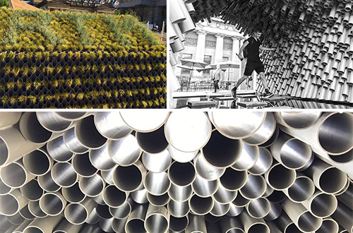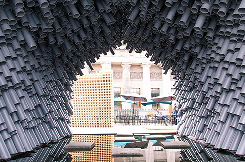 Paralon bekas yang dipakai di paviliun ini selain menghemat biaya konstruksi juga bisa menolong mempekerjakan orang-orang yang berpendapatan rendah.
