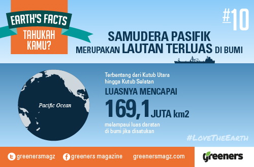 Samudra Pasifik merupakan lautan terluas di bumi, dengan luas 169,1 juta kilometer persegi. Terbentang dari Kutub Utara hingga Kutub Selatan. Luasnya melampaui luas daratan di bumi jika disatukan.