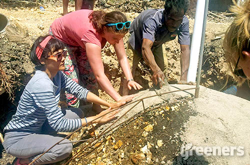Pembuatan fasilitas biogas dilakukan bersama dengan volunteer dari Indonesia dan Belanda serta warga setempat. Foto: greeners.co/Hermitianta Prasetya