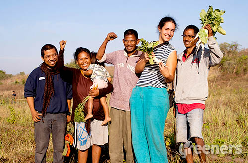 Volunteer dan warga berfoto bersama sambil menunjukan hasil ladang. Dengan memanfaatkan energi terbarukan, sawah dan ladang warga Lewa, Sumba Timur, dapat di aliri air. Foto: greeners.co/Hermitianta Prasetya