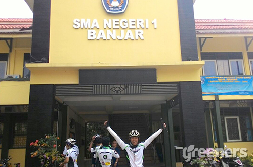 Selanjutnya, sepeda kami kayuh melalui jalur alternatif, yakni jalur Cimaragas. Jalur tersebut kami pilih karena jalurnya paling dekat dari tempat kami menginap dan karena kondisi jalannya sepi dari kendaraan- kendaraan besar. Jalur dari Cimaragas menuju Banjar cenderung mudah dilalui karena sebagian besar jalannya menurun. Pukul 11.00 WIB, kami sudah melintasi kota Banjar dan sudah tiba di tugu perbatasan Jabar dan Jateng. Kami pun menyempatkan diri untuk berfoto bersama di tugu perbatasan tersebut.
