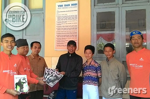 Pukul 10.30 WIB, kami berpisah dengan 4 pesepeda yang mengantar kami sampai tiba di kota Solo. Kami lantas kembali melanjutkan perjalanan. Kota Sragen menjadi kota tempat kami beristirahat makan siang. Saat kami beristirahat, tepat diseberang jalan, kami melihat Sekolah Menengah Pertama Negeri 1 Sragen. Di sekolah ini, kami membagikan 100 majalah Greeners. Ternyata, SMPN 1 Sragen pernah mendapatkan penghargaan Adiwiyata sebagai sekolah berwawasan lingkungan.