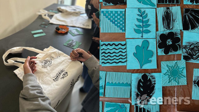 Dalam rangka campus visit di Editorial Trip Bandung ini, Greeners.Co tidak hanya mengadakan talkshow. Ada banyak keseruan lainnya, misalnya mengenalkan cap cukil ke mahasiswa. Inisiasi ini untuk memperkenalkan teknik cetak tinggi.
