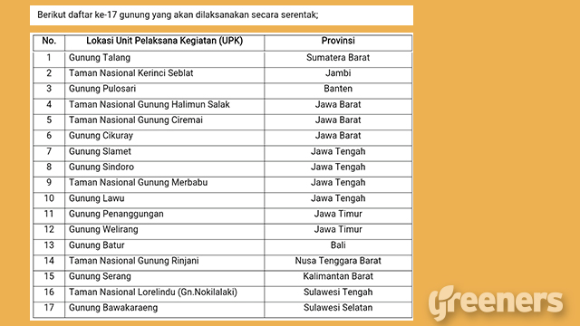Daftar 17 gunung yang akan disambangi oleh Sapu Jagad pada tanggal 18 hingga 24 Agustus 2017. Sumber: Trashbag Community