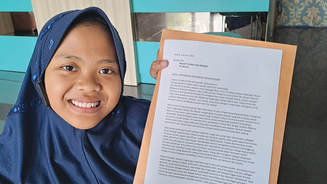 Jakarta (Greeners) – Penggiat lingkungan cilik asal Gresik, Aeshnina Azzahra kembali mengirimkan surat kepada Presiden Joko Widodo (Jokowi). Dalam suratnya ia mengkritisi penanganan sampah plastik di Indonesia. Menurutnya, sampah plastik dan sampah kemasan di Indonesia telah mencemari hutan, pegunungan, perairan, hingga mengancam kesehatan manusia.