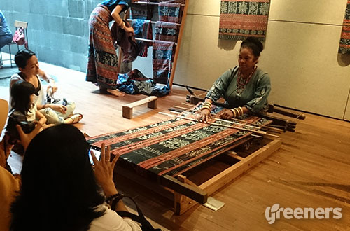 Seorang penenun asli Sikka tengah menunjukkan cara menenun kain kepada pengunjung. Foto: greeners.co/Renty Hutahaean
