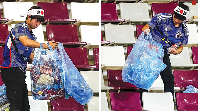 Namun, bukannya langsung pesta pora merayakan kemenangan, fans Jepang justru mengeluarkan kantong sampah sekali pakai warna biru muda dan mulai membersihkan seisi stadion. Begitu wasit meniup peluit tanda pertandingan usai, fans “Samurai Biru” bersiap memunguti sampah bungkus makanan hingga cangkir minuman kosong di tribun penonton.