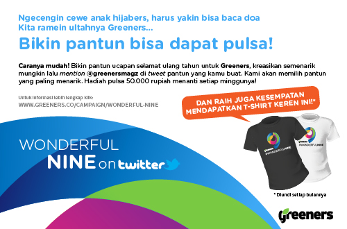Melalui akun twitter @greenersmagz ikuti lomba bikin pantun berhadiah pulsa 50 ribu untuk 3 pemenang setiap minggunya. Lomba pantun akan dimulai tanggal 20 Juli 2014. Pantau terus linimasa akun twitter kami ya atau follow langsung twitter kami