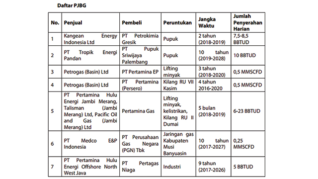 Daftar tujuh kontrak Perjanjian Jual Beli Gas Bumi (PJBG) yang telah ditandatangani di acara Eksebisi dan Konvensi IPA ke-42 di Jakarta. Sumber: IPA