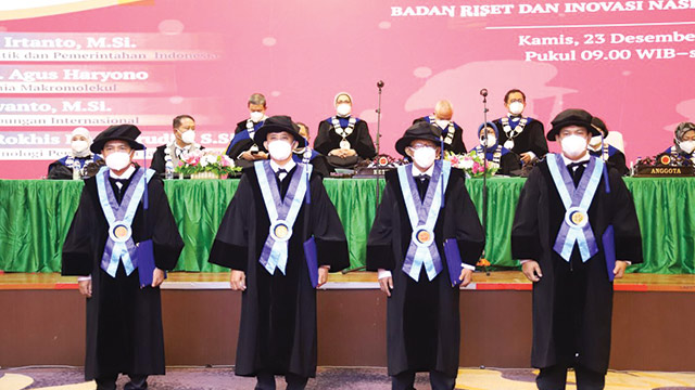 Profesor Riset Agus Haryono (kedua kiri) berfoto bersama usai orasi dan pengukuhannya di Jakarta, baru-baru ini. Foto: BRIN