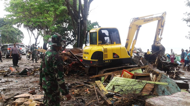 Personel TNI dan alat berat telah diturunkan untuk membantu pencarian korban tsunami yang berasal dari Selat Sunda. Foto: BNPB