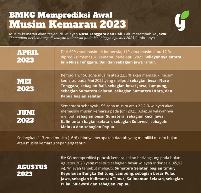 BMKG memprediksi awal musim kemarau pada April 2023 akan terjadi di wilayah Nusa Tenggara dan Bali. Lalu merambah ke Jawa. “Kemudian berkembang di wilayah Indonesia pada Mei hingga Agustus 2023,” imbuhnya.