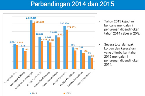 “Kalau bencana terbesar yang terjadi pada 2015 itu adalah kebakaran hutan dan lahan. Dalam catatan BNPB, ada 24 orang tewas akibat kebakaran hutan, 600.000 jiwa menderita infeksi saluran pernapasan dan 2,61 juta hektar lahan terbakar. Kerugian ekonomi akibat kebakaran hutan tahun ini pun mencapai Rp 221 triliun dan wilayah yang paling banyak mengalaminya adalah Sumatera Selatan, Kalimantan Tengah dan Papua,” tambahnya.