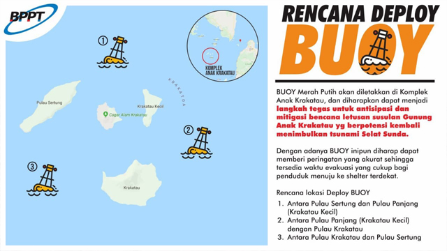 “Adanya tiga buah Buoy di satu kompleks Anak Krakatau tersebut akan memberi peringatan yang lebih akurat sehingga tersedia waktu evakuasi yang cukup bagi penduduk setempat menujut ke shelter terdekat. Dengan alat ini diharap dapat meminimalkan dampak tsunami,” katanya.