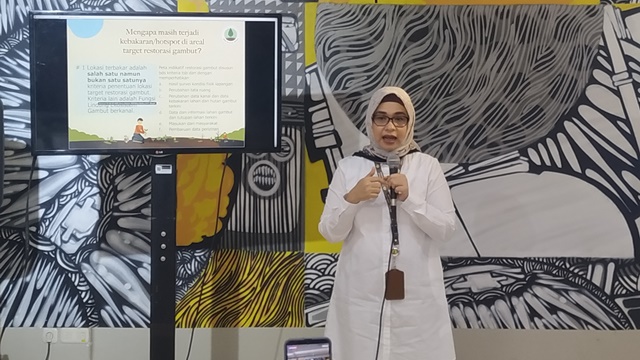 Deputi Bidang Edukasi, Sosialisasi, Partisipasi, dan Kemitraan Badan Restorasi Gambut, Myrna A. Safitri, menjelaskan penyebab kebakaran di areal restorasi, dalam diskusi media “Empat Tahun Merawat Gambut” di Jakarta, Rabu (22/01/2010). Foto: www.greeners.co/Dewi Purningsih