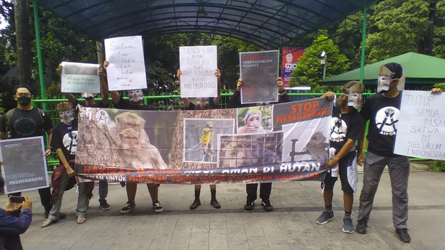 Aksi Peduli Monyet dan Animal Friends Jogja berdemonstrasi di depan kantor KLHK terkait bahaya monkeypox. Foto: Istimewa