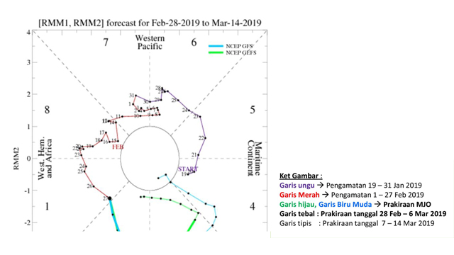 Menurut BMKG analisis tanggal 27 Februari 2019 lalu menunjukkan MJO aktif di fase 1 dan diprediksi tetap aktif hingga dasarian II Maret 2019. Berdasarkan peta prediksi spasial anomali OLR (sensor inframerah satelit), di akhir dasarian III Februari 2019 wilayah subsiden/kering masih mendominasi wilayah Indonesia. Kemudian pada dasarian I Maret 2019 wilayah konvektif mulai memasuki Indonesia bagian barat, terus meluas ke bagain Timur dan mendominasi wilayah Indonesia hingga dasarian II Maret 2019 yang berpotensi meningkatkan peluang pembentukan awan hujan di daerah tersebut.
