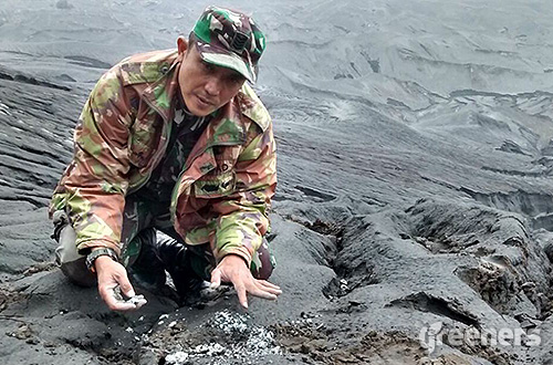 Petugas menunjukkan material vulkanik baru yang terlontar dari kawah Gunung Bromo. Material vulkanik ini tersebar di beberapa titik di kawasan Gunung Bromo. Foto: greeners.co/Muhajir Arifin