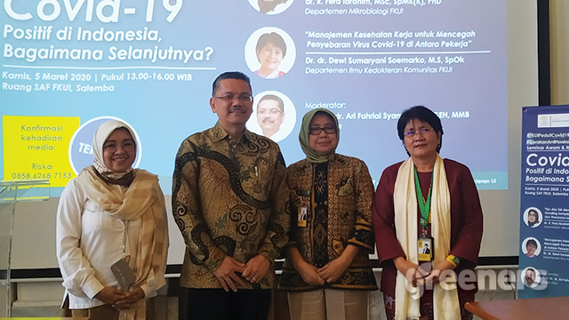 (Kedua dari Kiri) Prof. Dr. dr. Ari Fahrial Syam, dr. R. Fera Ibrahim, Dr. dr. Dewi Sumaryani Soemarko, dalam acara seminar Covid-19, di Fakultas Kedokteran Universitas Indonesia, di Salemba Jakarta Pusat, Kamis, 5 Maret 2020. Foto: www.greeners.co/Dewi Purningsih