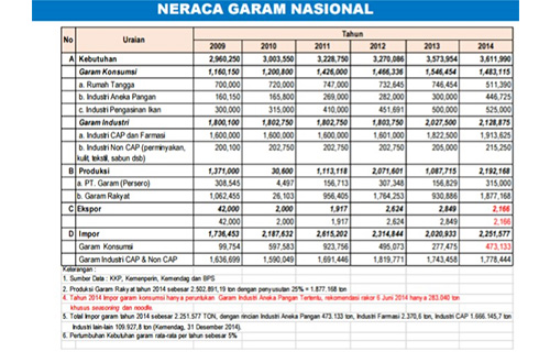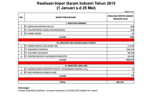 Sebagai informasi, adapun realisasi impor garam industri pada tahun 2014 itu tercatat sebesar 2,25 juta ton. Perinciannya adalah sebanyak 1,66 juta ton untuk industri CAP, sebanyak 473.133 ton untuk industri aneka pangan, sebanyak 2.370 ton untuk industri farmasi dan sebanyak 109.927 ton untuk industri lain-lain.