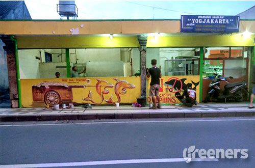 Kampanye #FreeBaliDolphins banyak melibatkan seniman Bali. Selain menggunakan brosur dan poster, kampanye ini juga disebarkan melalui seni lukis mural di Bali. Foto: dok. JAAN