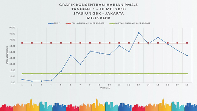 KLHK juga menyatakan, berdasarkan pemantauan kualitas udara dengan konsentrasi PM 2.5 sejak Januari s/d April 2018 terpantau kualitas udara Palembang tercatat 13,9 mikrogram/m3 dan di Jakarta tercatat 35 mikrogram/m3. Sementara Baku Mutu Harian menurut PP No. 41 Tahun 1999 adalah 65 mikrogram/m3 dan baku mutu menurut WHO 25 mikrogram/m3.