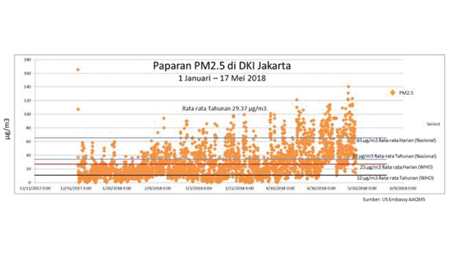 “Berdasarkan data hasil pemantauan kualitas udara oleh Kedutaan Amerika Serikat periode 1 Januari – 17 Mei 2018 menunjukkan bahwa pencemaran udara dengan parameter PM2.5 dengan rata-rata tahunan 29,37 mikrogram/m3 atau telah melampaui baku mutu rata-rata tahunan WHO (10 mikrogram /m3) maupun rata-rata harian WHO (25 mikrogram /m3). Sementara baku mutu rata-rata harian (Nasional) adalah 65 mikrogram/m3 dan baku mutu rata-rata harian adalah 35 mikrogram/m3,” papar Ahmad kepada Greeners melalui pesan singkat.
