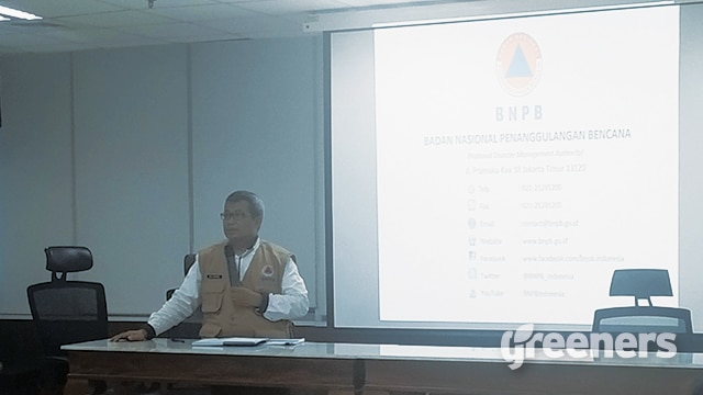 Kepala Pusat Data, Informasi, dan Hubungan Masyarakat Badan Nasional Penanggulangan Bencana (BNPB) Agus Wibowo, saat menerangkan pola musim penghujan, di Jakarta Timur, Selasa, 17 Desember 2017. Foto: www.greeners.co/Dewi Purningsih