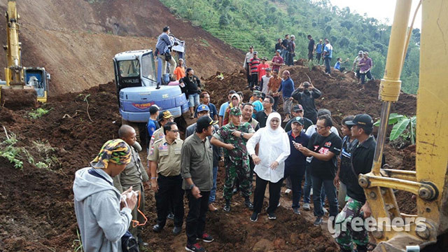 Menteri Sosial Khofifah Indar Parawansa (kemeja putih), mendatangi lokasi bencana longsor pada Minggu (02/04/2017). Ia juga memberikan bantuan senilai Rp1,34 miliar. Foto: greeners.co/Muhajir Arifin