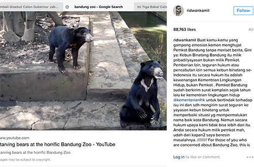 Walikota Bandung Ridwan Kamil dalam akun instagramnya menyatakan bahwa permasalahan kesejahteraan satwa di Kebun Binatang Bandung sudah lama menjadi perhatiannya. Namun secara hukum, Pemkot Bandung hanya bisa menyerahkan penyelesaian masalah tersebut kepada KLHK. Screen capture: Ridwan Kamil/Instagram