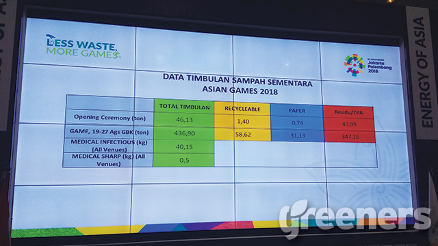 Berdasarkan data timbulan sampah sementara yang diolah dari program Less Waste More Games, hingga 27 Agustus 2018, total timbulan sampah hanya di Gelora Bung Karno mencapai 436,90 ton dengan rincian 58,62 ton sampah kategori recycleable (misalnya: botol plastik), 31,13 ton sampah kertas, dan 347,15 ton sampah residu.