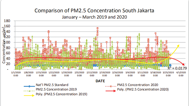 Sementara di Jakarta Selatan, rata-rata konsentrasi PM2,5 pada saat diterapkan physical distancing antara tanggal 16 – 25 Maret 2020 adalah 44.62 µg/m3. Menurut Ahmad, ini juga masih lebih tinggi dari rata-rata pada periode tahun lalu (30.49 µg/m3), sekalipun mulai menunjukkan penurunan secara berangsur-angsur.