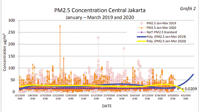 Direktur Eksekutif KPBB Ahmad Safrudin mengatakan penerapan pembatasan fisik belum berhasil menurunkan pencemaran udara di DKI Jakarta. Kualitas udara masih berada pada kategori tidak sehat, meskipun berada di bawah Nilai Ambang Batas (NAB) yang diperbolehkan yakni 65 µg/m3. Selama sepuluh hari pengukuran, dari 16 sampai 25 Maret 2020, diketahui konsentrasi rata-rata PM2,5 sebesar 44.55 µg/m3.