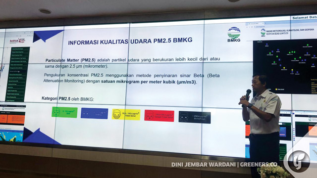 Kepala Sub Bidang Informasi Pencemaran Udara BMKG Taryono menjelaskan tentang pencemaran udara Jakarta. Foto: Dini Jembar Wardani