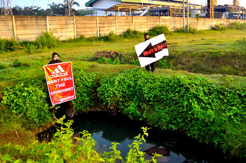 Para aktivis Greenpeace mendatangi pabrik adidas di Indonesia yang berada di Serang, Banten pada Rabu (21/05) kemarin. Di sana, mereka membentangkan sebuah spanduk berukuran raksasa yang bertuliskan “Adidas: Don’t Foul The Environment” (jangan curangi lingkungan), di sebuah lapangan bola dekat dengan fasilitas produksi adidas. Fasilitas ini diketahui memproduksi berbagai merchandise dan perlengkapan olahraga resmi adidas untuk Piala Dunia 2014.