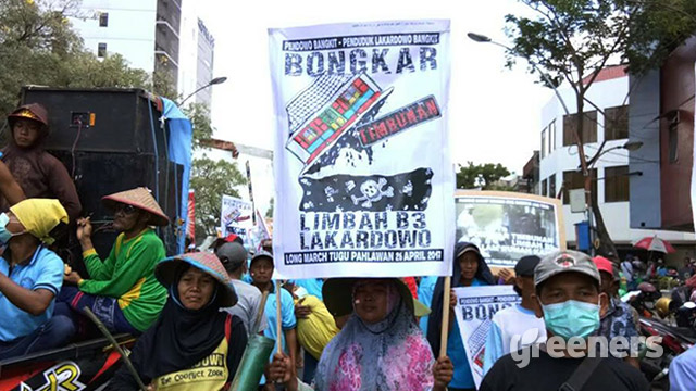 Malang (Greeners) – Ratusan warga Desa Lakardowo, Kecamatan Jetis, Kabupaten Mojokerto, mendatangi Kantor Gubernur Jawa Timur, pada Rabu (26/06) pagi. Warga yang tergabung dalam Pendowo Bangkit ini meminta Gubernur Jawa Timur Soekarwo bersikap tegas terhadap persoalan lingkungan di Lakardowo dan sekitarnya yang terdampak bahaya limbah Bahan Beracun dan Berbahaya (B3).