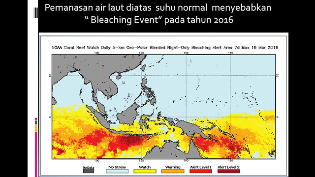 Sumber: Hasil pemantauan karang oleh NOAA pada 16 Maret 2016. Disampaikan oleh Peneliti Ahli Terumbu Karang P2O LIPI Suharsono pada Diskusi Publik tentang Potensi Stok Terumbu Karang Indonesia, di Jakarta, Rabu (28/11/2018).