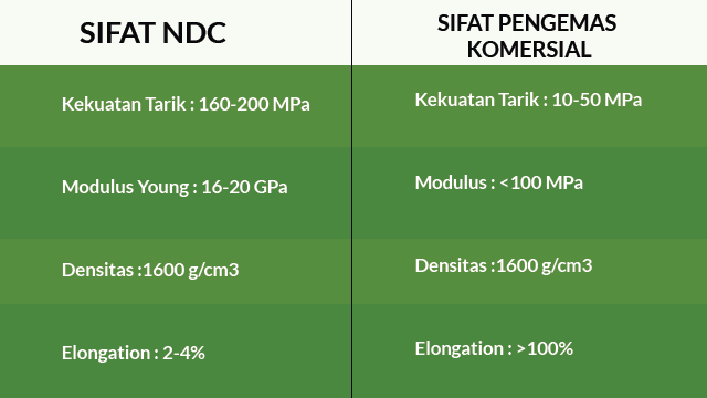 Profesor Riset Loka Penelitian Teknologi Bersih LIPI, Myrtha Karina Sancoyorini mengatakan sejak diteliti tahun 2001 NDC yang dihasilkan oleh bakteri Acetobackter xylinum ini awalnya diperuntukan sebagai bahan polimer alam untuk kantong kresek. Namun seiring berjalannya waktu dan berkembangnya penelitian, NDC ini digunakan sebagai plastik jenis high functional material plastic karena lapisan NDC bersifat sangat kaku (nilai modulus elastisitasnya tinggi) dan regas (nilai elastisitasnya rendah). NDC mempunyai kekuatan tarik hingga 200 megapascal.