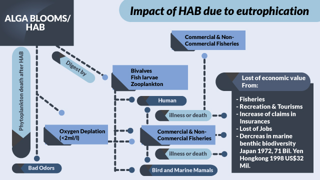 Gambar: Alur dampak yang ditimbulkan marak algae akibat euttrofikasi. Sumber: diadopsi dari laporan Wouthuyzen (2007)