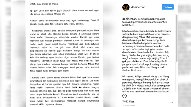 Menanggapi kejadian ini, Doni mencoba untuk mengklarifikasi hal-hal yang dituduhkan terhadapnya. Di dalam akun instagramnya, @doniherdaru, Doni memaparkan kondisi Nina di shelter.