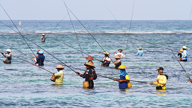 Nelayan tradisional Bali memancing di air dangkal Pantai Nusa Dua, Bali (28/4/2013). YLBHI menekankan Omnibus Law melanggengkan proyek strategis yang abai pembangunan berkelanjutan dan menghabisi penghidupan nelayan dan petani. Foto:Shutterstock.