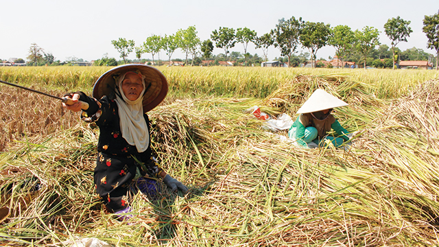 Perempuan buruh tani memanen padi di Pekalongan, Jawa Tengah (30/8/2020). Solidaritas Perempuan mengungkap, Omnibus Law akan memperdalam dan memperluas konflik agraria, dimana perempuan seringkali mengalami intimidasi dan kekerasan yang berlapis. Foto: Shutterstock.