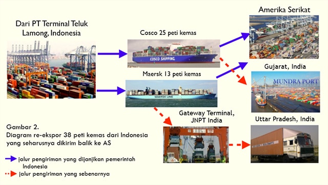 Dengan menggunakan teknik pelacakan pengapalan, Basel Action Network (BAN), sebuah grup pemantau perdagangan limbah global, menemukan ada 58 peti kemas yang berasal dari Amerika Serikat yang dikirim oleh 3 maskapai perkapalan yang berbeda: 25 peti kemas dikapalkan oleh Cosco Shipping Line, 13 peti kemas oleh Maersk Shipping Line, dan 20 lagi oleh Hyundai Line.